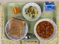 ●牛乳●セサミトースト●ポークビーンズ●ダイスチーズサラダ●オレンジ