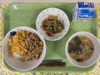 ●牛乳●二色そぼろ丼●糸こんと青菜のピリ辛炒め●みそ汁