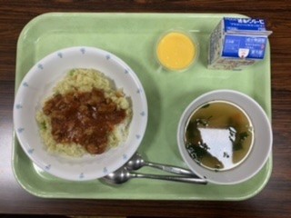 カレーピラフチキンソースがけ・青菜ときのこのスープ・かぼちゃプリン