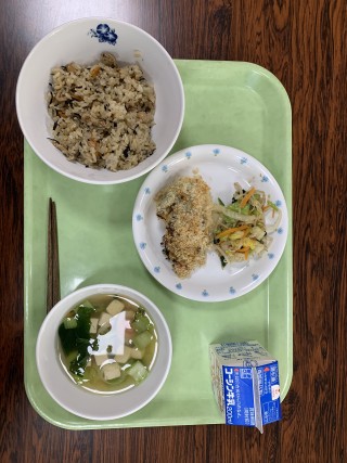ひじきご飯・魚のみそマヨ焼き・野菜のごま酢和え・すまし汁
