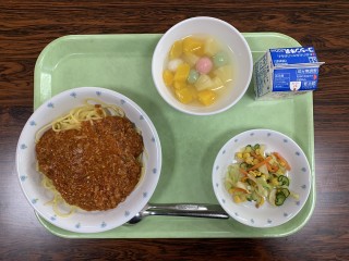 ミートソーススパゲッティ・ガーリックサラダ・フルーツポンチ