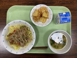 チンジャオロース焼きそば・白菜スープ・さつまいもチップス