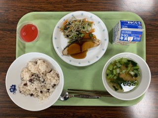 赤飯・ぶりの照り焼き・もやしのごま和え・お吸い物・紅白ゼリー