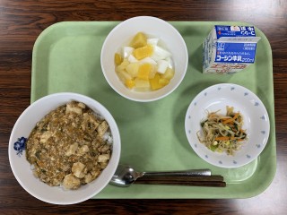マーボー豆腐丼・野菜のナムル・杏仁豆腐