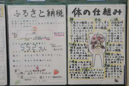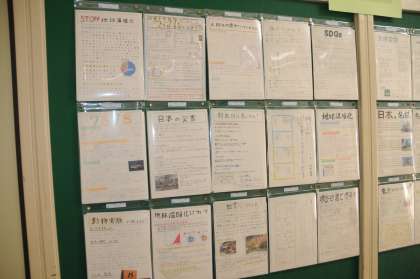 1年生が生活している5階の廊下の掲示物です。以前は故事成語の4コママンガが掲示されていましたが、今は、総合的な学習の時間の調べ学習で作成した作品が掲示されています。一人ひとりがテーマを決めて調べたものを、イラストや色を工夫して作成したものです。今後は、発表会も予定しているようです。