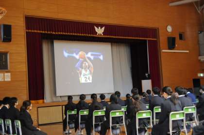 1年生が調べ学習の発表会を行いました。一人ひとりが自分の興味ある事柄について調べ、それを各クラスで発表し、本日は各クラスの代表生徒が学年全員の前で発表しました。効果的なノートの取り方だったり、すき焼きのお肉としらたきの関係だったり、好きなバスケットボールの選手についてだったりと、内容は様々です。はっきりとした大きな声で発表しており、聞いていておもしろかったです。