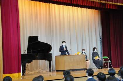本日の午後、離任式を実施しました。昨年度末に本校去られた先生方の内、3名の方が出席してくださいました。私から離任された先生方の紹介をした後、生徒から感謝の言葉と花束の贈呈がありました。その後、先生方よりご挨拶をいただきました。離任された先生方には、本当にお世話になりました。4月からの新たな職場でのご活躍を祈念しております。
