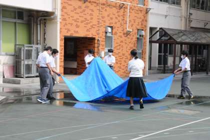 朝の登校時の様子です。校門付近にいる先生方に元気よくあいさつをして、靴箱に向かいます。友人と楽しそうにお話をしながら、今日の一日が始まります。校庭では、昨日の部活動の大会で使用したシートをきれいにしている生徒もいました。