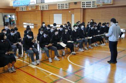 明日26日(木)は、都立の推薦入試日です。本日の午後、推薦入試の受験者を対象に、事前指導を行いました。持ち物や各校で異なる集合時間のこと、また、交通機関が乱れたときの対応などについて、学年の先生からていねいなお話がありました。受験生のみなさん、落ち着いて試験に臨んできてください。応援しています。