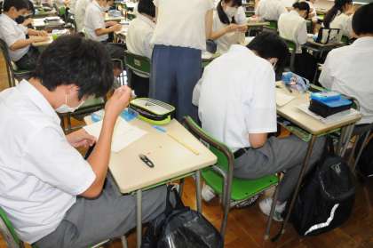 6月もあと2日になりました。生徒たちは日々の学校生活に落ち着いて取り組んでいます。写真は、2校時の2年生の家庭科の授業の様子です。写真も飾ることのできる布製の小物入れを製作していました。「衣食住の生活」の学習です。普段あまり使わない針と糸に苦戦しながら、懸命に取り組んでいました。すてきな作品ができるといいですね。
