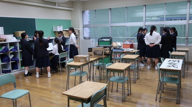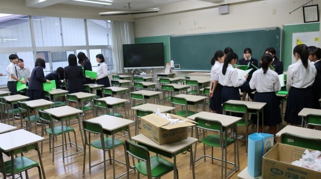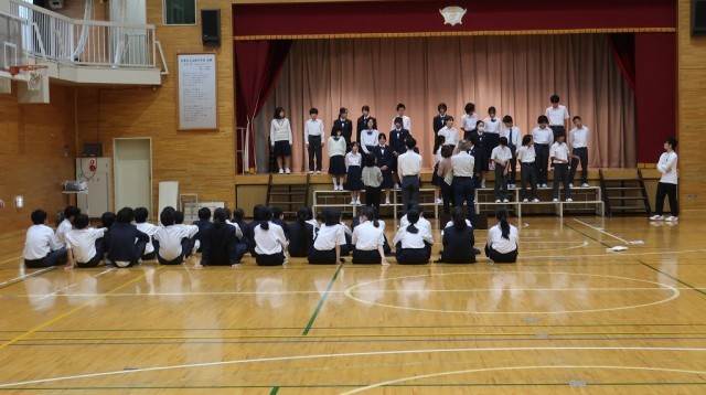 1年生は初めての学年練習で体育館で入退場の練習と合唱隊形の確認を行い、2、3年生は各クラスでパート練を行っていました。
