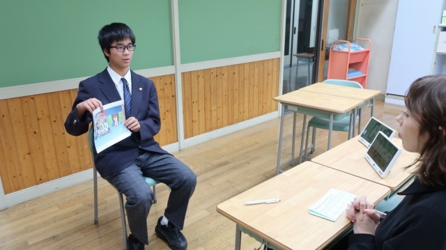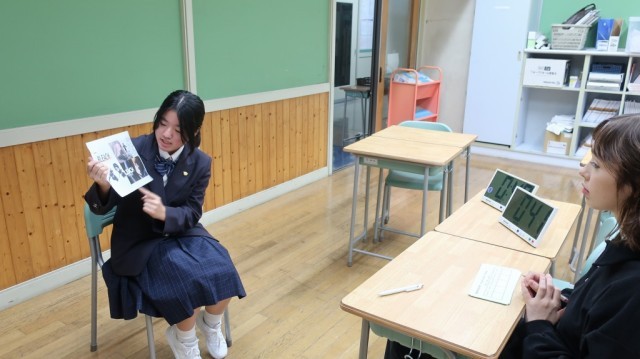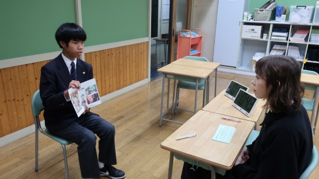 ピクチャーカードを用いてALTの先生へ説明している様子です。