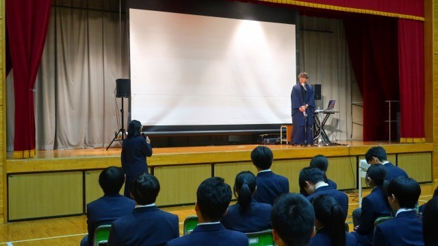 講演では三味線の説明のほかに、岡野さんの中学から高校時代の話、高校卒業後に単身で渡米し、ニューヨーク滞在時に1ケ月間ストリートロックで三味線を弾いていたこと、そして思ったら「必ず行動すること」など生徒たちにとってこれからの生き方について深く考えさせられる内容であり、今後の成長につながる内容でした。