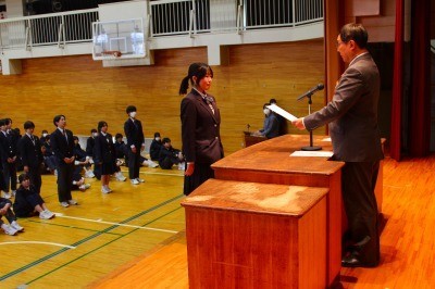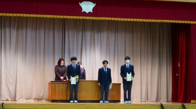 美化委員が主催した教室美化週間「第2回 めざせピカピカ中学校」の表彰が行われ美化委員長より賞状が授与されました。