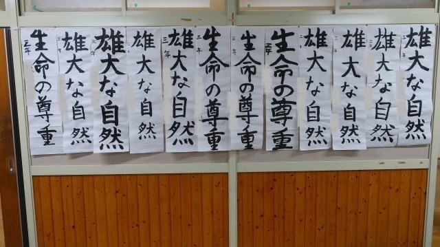 現在、国語科では書写を行っています。今回は3年生の「雄大な自然」、「生命の尊重」の書写の様子を紹介します。集中して書の向かい合う3年生をご覧ください。 -