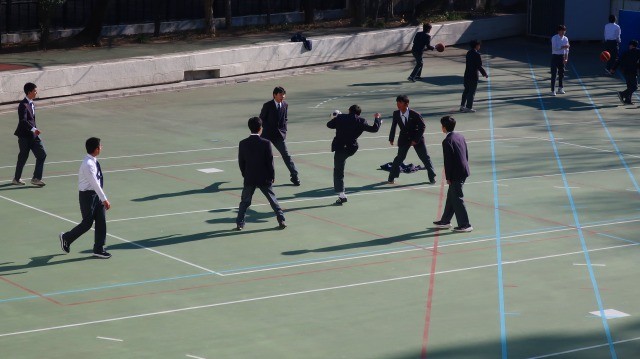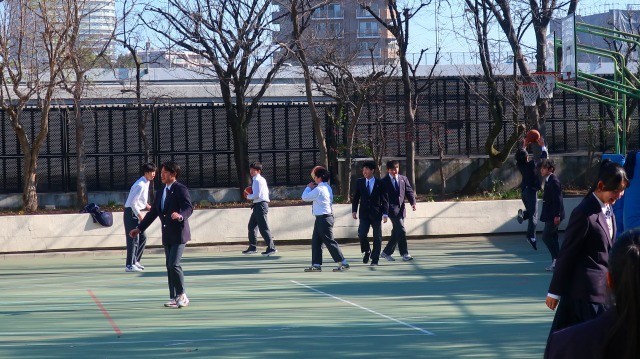 校庭で遊ぶ生徒たちの中には、上着を脱いでいる生徒もいました。