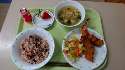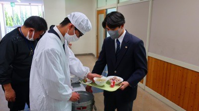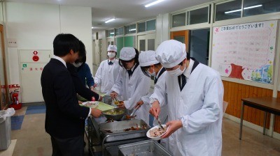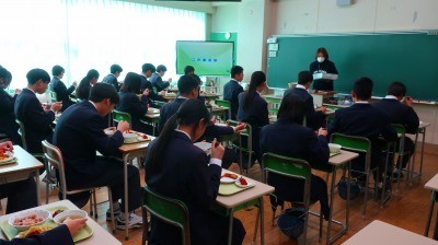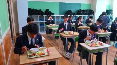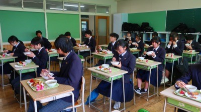 テスト後、緊張が解けた給食の様子を紹介します。メニューは、けんちんうどん、根菜ときゅうりの胡麻ドレ和え、大学芋です。