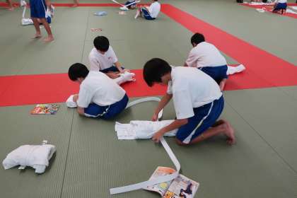 リバーサイドスポーツセンターの武道場で1年生が柔道の学習を行いました。初めての柔道の学習で、道着の着かたや片付け方にも悪戦苦闘していましたが、テキストをじっくり読んだり、友達と教え合ったりして、最後まで集中して取り組みました。畳もとっても気持ちがよいですね。来週まで、礼儀作法を含め、しっかりと学習しましょう!