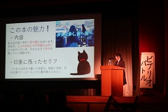 写真は、第3学年舞台発表(修学旅行報告)、第2学年舞台発表(オーストラリア海外派遣研修)と舞台発表(ビブリオバトル)の風景です。