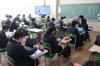 1年生は、漢文の学習をしています。中国の故事『矛盾』を読み、自分の選んだ故事成語を使った体験文を書いています。故事成語を調べてみると、好きな言葉や座右の銘などで紹介される言葉がたくさんありますね。パワーポイント等を使って、上手に体験文をまとめることができていました。