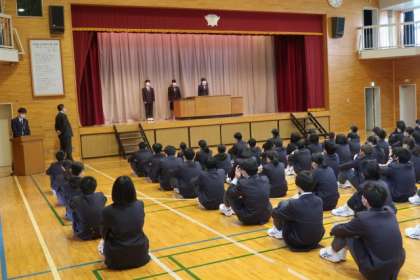 午後は、転出された先生方を迎え、離任式を実施しました。学年、授業や部活動などでお世話になった先生方に感謝の言葉を述べ、花束を贈呈しました。その後、離任された先生方からお言葉をいただき、全員で校歌を歌いました。先生方、本当にお世話になりました。ありがとうございました。