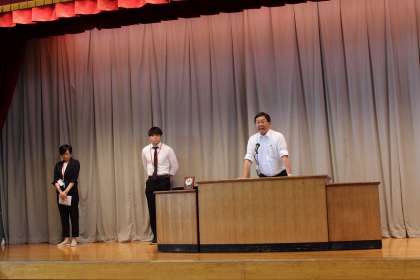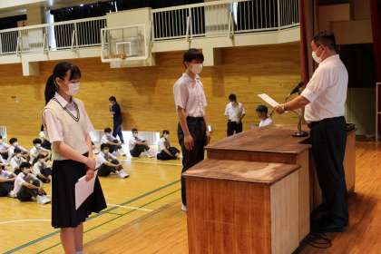 生徒会朝礼を行いました。生徒会長から運動会の振り返りと水曜日からの期末考査についての話がありました。金曜日には1学期最後の常任委員会があり、土曜日からは7月です。まずは、万全の準備をして期末考査を終え、しっかりと1学期のまとめをしていきましょう。表彰は、バドミントン部の台東区での優勝のものです。ソフトテニス部も週末の大会で好成績を収めたようです。40名に満たない3年生ですが、各部素晴らしい成績を残しています。