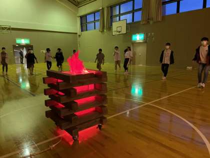キャンプファイヤーは屋内で実施!グループごとのスタンツは練習の成果が発揮できたでしょうか?