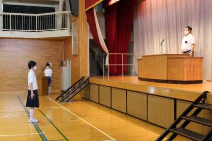 全校朝礼を行いました。校長先生からはイソップ童話の「子どもとカエル」の話から、いじめについての話がありました。自分は遊んでいるつもりでも、楽しいと思っていることでも・・・相手にとってはどうでしょうか、相手の身になって考え、行動することが大切ですね。表彰も実施しました。部活動等での、たくさんの生徒の活躍、とてもうれしいですね。