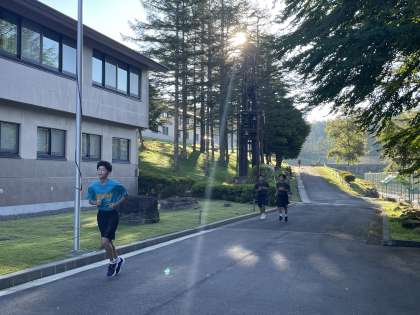 気持ちのよい朝日を浴びて、朝練です。さわやかな高原の朝ですが、厳しい坂道に早くも汗びっしょりです。今日も一日頑張りましょう!