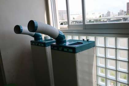 まだまだ残暑厳しい日々。午前中は東階段の窓から熱風が入り込みます。少しでも涼しい風をと、本校の秘密兵器スポットックーラーを設置。効果覿面!
