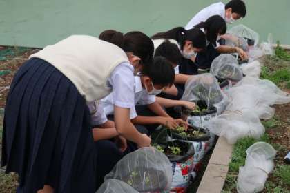 1年生が屋上で育てている大根の間引きを行いました。ここのところ天候も不安定ですが、子葉の間から本葉が出て、みんな元気に育っていました。今日は元気に育っている3本だけを残して、丁寧に間引きを行いました。この調子で収穫まで元気に育つといいですね。