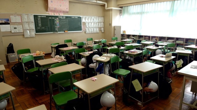 今回はJアラートを想定して、窓を閉め、机の下に避難しました。静かに落ち着いて避難できていました。