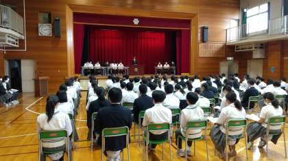 感染防止のため、3年生のみが体育館に入り、1・2年生は教室でリモート参加しました。