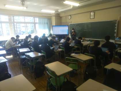 2年数学です。一人ひとりタブレット端末を用いて、グループワーク活動を行っていました。