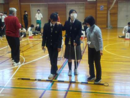今日午後、体育館では1年生がブラインド・車いす体験を行いました。