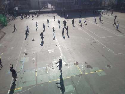 外で友人と遊ぶ生徒、体育館でボールで遊ぶ生徒(今日は月曜日で2年生の一部学級)、図書室で読書をして過ごす生徒、一人ひとりが思い思いの場所で過ごしています。
