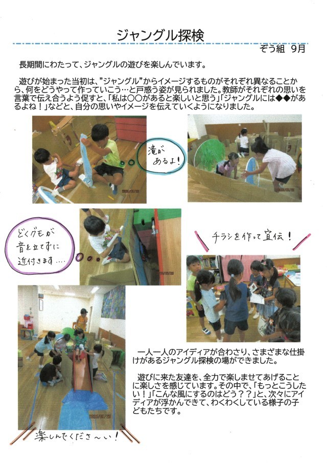 教師がそれぞれの思いを言葉で伝え合うよう促すと、「私は○○があると楽しいと思う」「ジャングルには●●があるよね」などと、自分の思いやイメージを伝えていくようになりました。