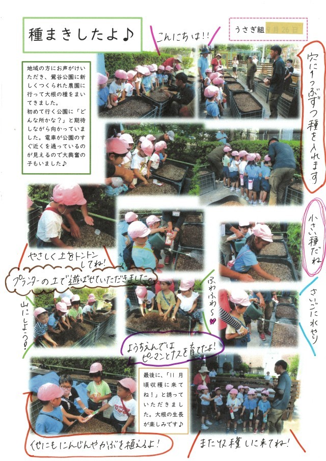 地域の方と種まきをしながら、「幼稚園ではピーマンとナスを植えたよ」「他にはニンジンやカブを植えるよ」と、いろいろなことをお話しました。