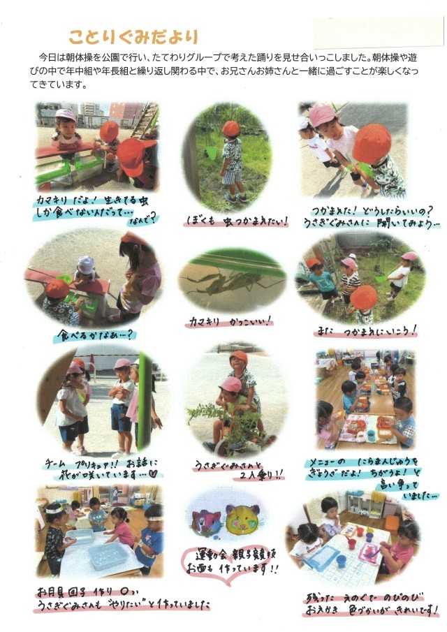 朝体操を公園で行い、ほしのこグループ(たてわり)で考えた踊りを見せ合いっこしました。