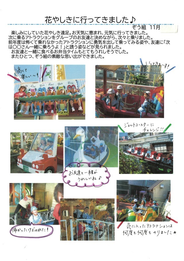 昨年度は怖くて乗れなかったアトラクションに勇気を出して乗ってみる姿や、友達に「次は○○さん、一緒に乗ろうよ」と誘う姿等が見られました。