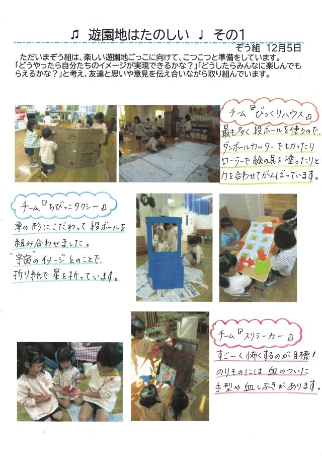 ぞう組は遊園地ごっこに向けて、こつこつと準備をしています。