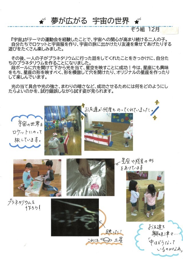 自分たちでロケットと宇宙服を作り、宇宙の旅に出かけたり友達を乗せてあげたりして遊びました。