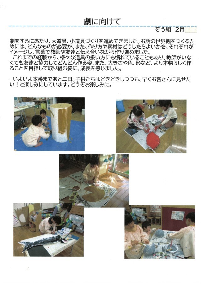 お話の世界観を作るためには、どんなものが必要か、作り方や素材はどうしたらよいのかを、それぞれがイメージし、言葉で教師や友達と伝え合いながら作り進めました。