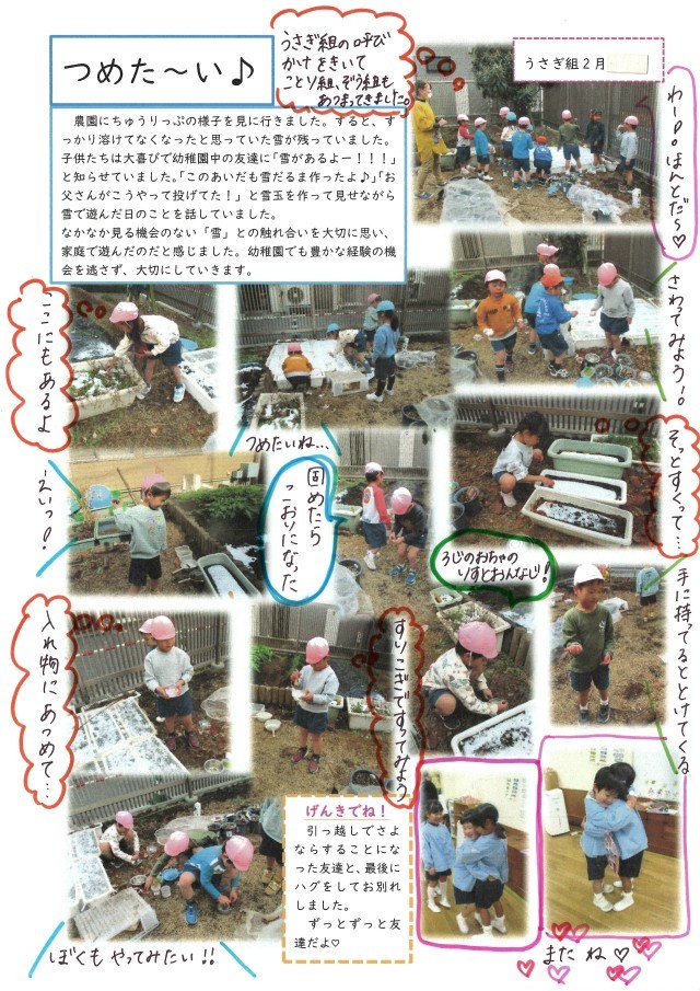 子供たちは大喜びで幼稚園中の友達に「雪があるよー」と知らせていました。