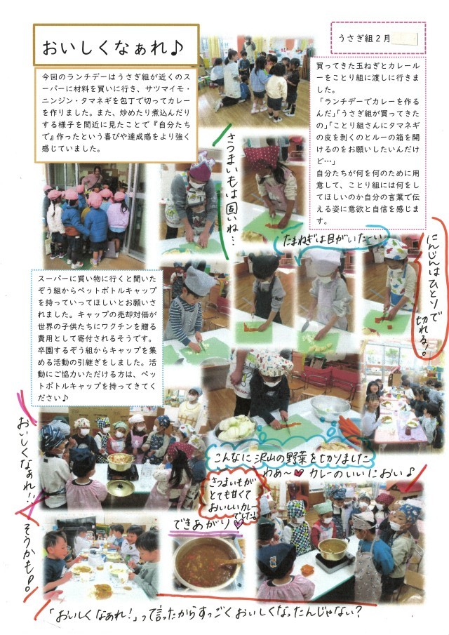 今回のランチデーはうさぎ組が近くのスーパーマーケットに材料を買いに行き、サツマイモ、ニンジン、タマネギを包丁で切ってカレーを作りました。