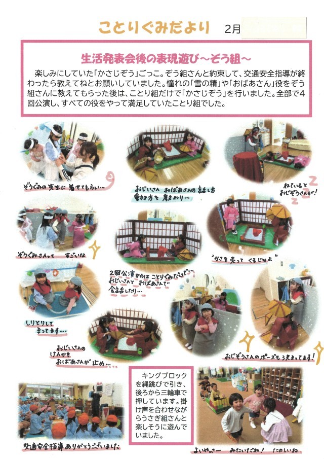 憧れの雪の精やおばあさん役をぞう組に教えてもらった後は、ことり組でかさじぞうごっこをしました。