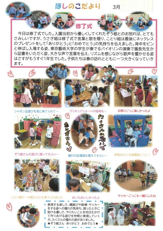 入園当初から優しくしてくれたぞう組とのお別れは、とてもさみしいですが、うさぎ組は修了式で言葉と歌を贈り、ことり組は最後にネックレスのプレゼントをして「ありがとう」と「おめでとう」の気持ちを伝えました。