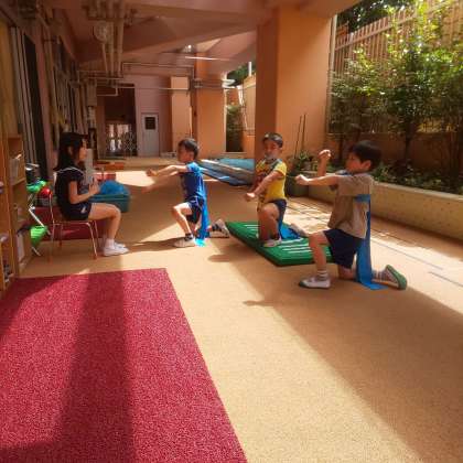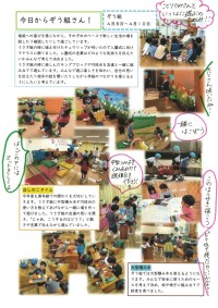 幼稚園に来てくれた5年生を見ると「大きいね」「かっこいいね」などと驚いていました。応援団を見せてもらうと、その迫力の凄さとかっこいい動きに、ぞう組もみんな真剣に見ていました。終わると「すごい!!」「かっこよかった」と言い、たくさんの拍手でその思いを伝えました。