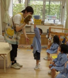 先生の歌、手遊びなどに「なんだろう」「たのしそう」と集まる姿もあります。
