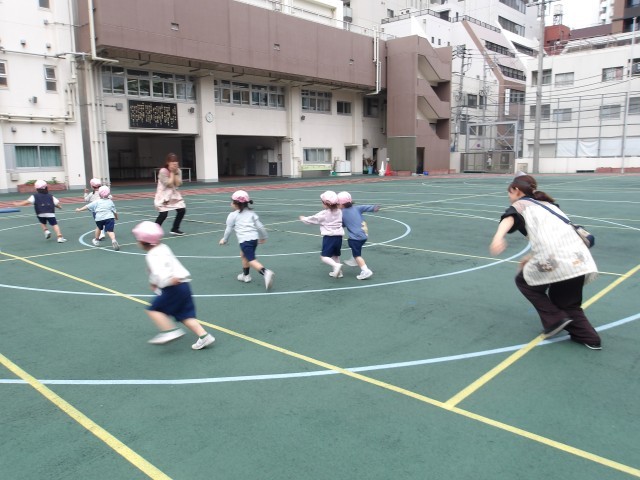 さくら組きく組は、鬼遊び、うんてい、砂場など、校庭で元気いっぱいに遊んでいます。